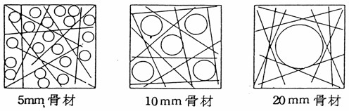 骨料粒徑越大,纖維越容易受骨材排擠壓迫,單位體積內纖維含量增加,如圖1-4所示,纖維容易互相糾結成球,纖維球又會(huì )造成骨材間分離。為了避免上述情形發(fā)生,必須選用粒徑較小的骨材。因此,粗骨料粒徑應≤20mm。