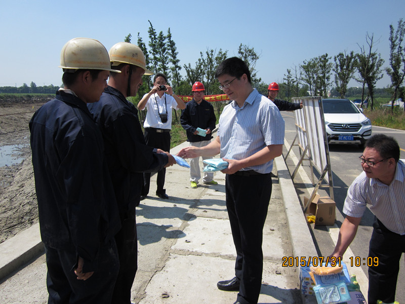 水建公司凌總經(jīng)理向七浦塘拓浚整治樞紐項目部一線(xiàn)人員分發(fā)防暑用品:
