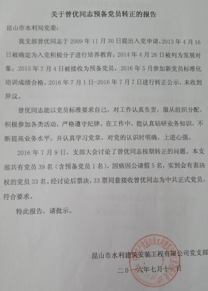 2016年7月9日召開(kāi)支部大會(huì ),全體黨員參加了會(huì )議,本次會(huì )議共有四個(gè)議程:一、按昆山市委組織部昆組通[2016]31號文“關(guān)于組織開(kāi)展2016年“黨章學(xué)習日”活動(dòng)的通知”精神:1、以黨支部為單位組織黨員原原本本學(xué)習黨章,支部書(shū)記上黨課;2、組織全體黨員普遍開(kāi)展一次重溫入黨誓詞活動(dòng)。3、開(kāi)展主題實(shí)踐活動(dòng):至少要開(kāi)展一次黨員志愿服務(wù),在職黨員進(jìn)社區,在職黨員年初已全部進(jìn)社區報到。上月我支部全體在職黨員均自愿參與了“黨員關(guān)受基金”“阜寧振災捐款”的捐款活動(dòng),共計金額為2300元和2500元。二、按水利局黨委昆水黨[2016]7號文《關(guān)于在水利系統黨員中開(kāi)展“學(xué)黨章黨規、學(xué)系列講話(huà),做合格黨員”學(xué)習教育的實(shí)施方案》的通知精神要求,2016年5月30日我支部發(fā)了關(guān)于“兩學(xué)一做學(xué)習教育實(shí)施方案” 的通知,1、要求每名在職黨員要認真學(xué)習文件精神,利用業(yè)余、休息時(shí)間進(jìn)行全面地、系統地學(xué)習黨章、黨規、學(xué)系列講話(huà)、學(xué)習《準則》《條例》,學(xué)習完成后結合自己的實(shí)際工作情況寫(xiě)一篇學(xué)習體會(huì )(可以打印,簽名必須手簽),于6月底前上交支部,年底將評選出幾名優(yōu)秀學(xué)習心得者;2、我支部結合公司的崗位不同的實(shí)際情況不同,設立了三個(gè)“黨員示范崗”:綜合業(yè)務(wù)部、檢測科一室、蘇州高新區水環(huán)境整治六標項目部,希望各位黨員向他們看齊,立足本職、盡心盡責。3、開(kāi)拓創(chuàng )新上黨課,今天優(yōu)秀黨員、年輕黨員兩名(鄧云澤、曾優(yōu))就“兩學(xué)一做”學(xué)習教育心得并聯(lián)系個(gè)人的實(shí)際工作給全體黨員上一次黨課。4、各位黨員在完成以上基本任務(wù)的情況下,還可以將黨員志愿服務(wù)與做合格黨員結合起來(lái),自愿參加一些黨員志愿服務(wù)活動(dòng)上報到支部,將在年底納入黨員考核中。三、討論、票決預備黨員曾優(yōu)轉正事宜