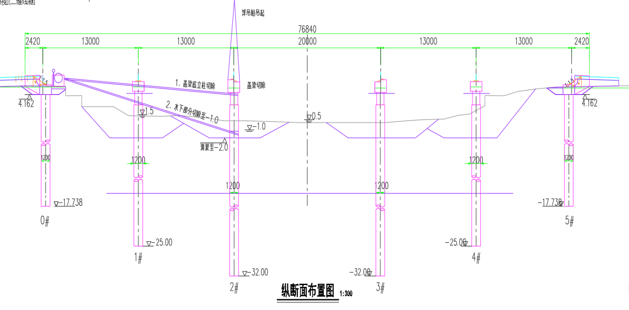橋梁已建部位全部拆除,目前河底高程橋樁位置中跨▽0.5,邊跨▽1.5,拆除工程量包括:1#、2#、3#、4#橋墩共8根水下灌注樁、8根橋墩,1#、2#、3#、4#共4塊蓋梁、0#、5#共兩塊橋臺。
