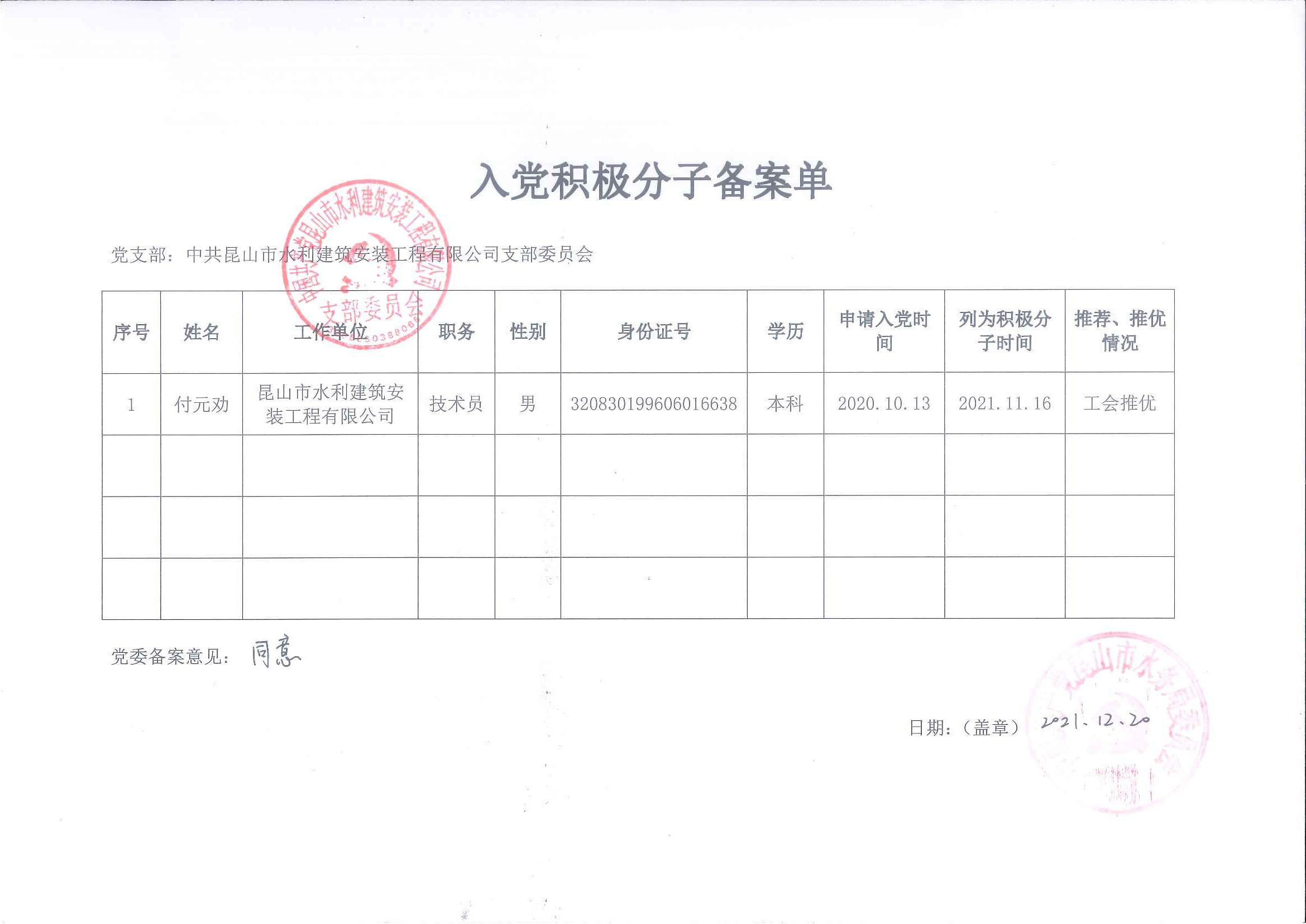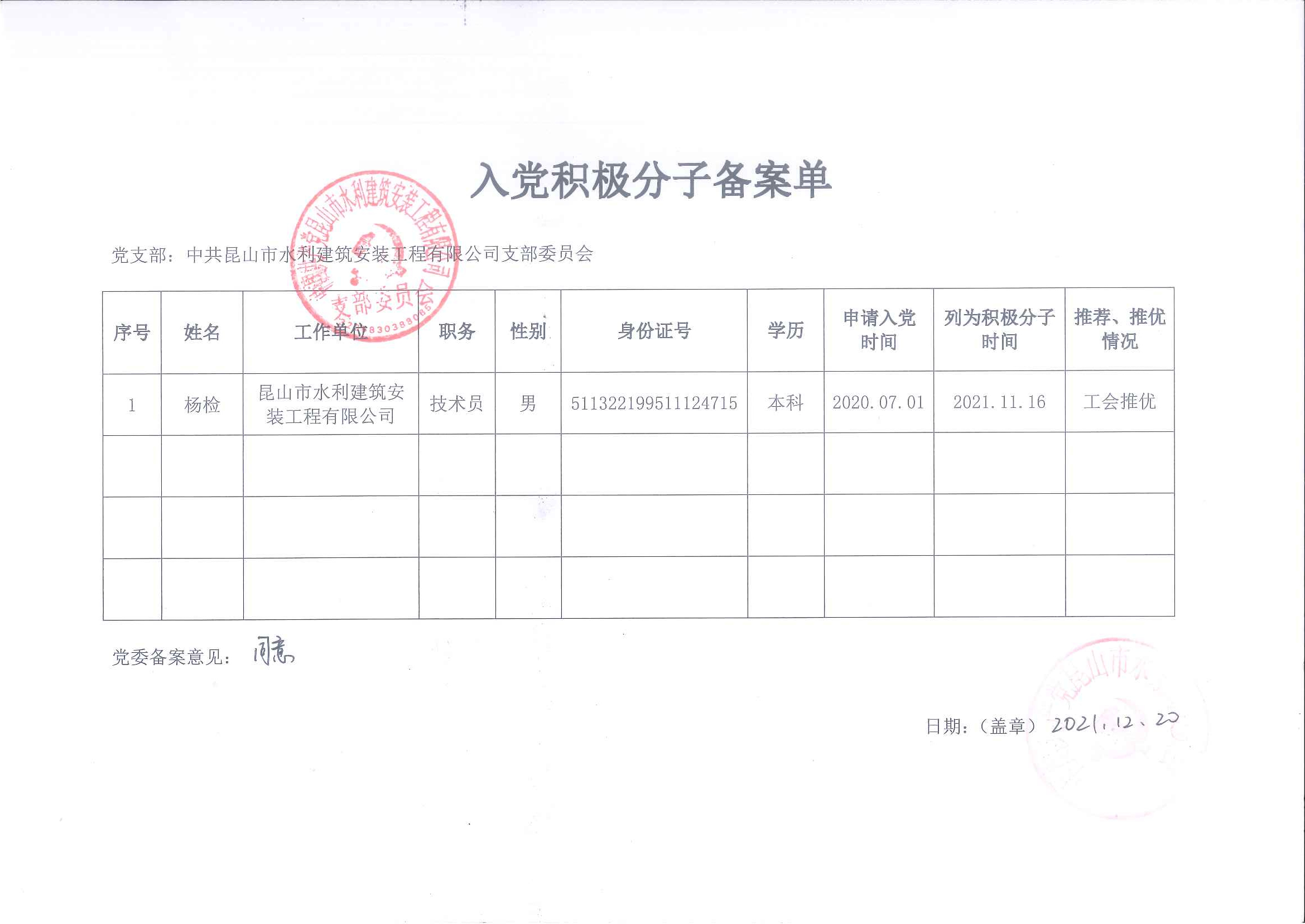 2021年11月16日,昆山市水利建筑安裝工程有限公司支部召開(kāi)黨員大會(huì ),對支委會(huì )確定楊檢同志為入黨積極積極分子的決定進(jìn)行討論,一致同意將楊檢、付元勸同志列為入黨積極分子,2021年12月20日水務(wù)局黨委批復同意。