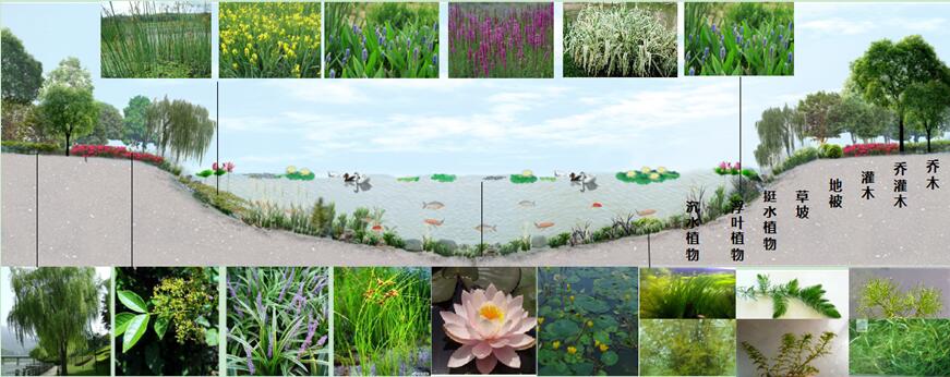 選用本地物種進(jìn)行水生植被重建,恢復多樣復雜的植物群落結構。在具體恢復過(guò)程中,應盡可能保留現有植被。包括常水位以下的水生植物、河坡植物、河灘植物和洪水位以上的河堤植物,根據水位和功能不同進(jìn)行配置。