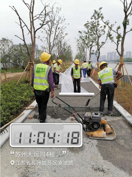 我公司中標的京杭大運河蘇州段[姑蘇區]堤防加固工程四標段工程的施工內容涉及堤防加固工程(景觀(guān)及水工)和支河橋梁工程。本標段(何山橋~晉源橋段)結合景觀(guān)方案,全線(xiàn)考慮新建健康步道與騎行道貫通布置,樁號20+268~24+675,道路總長(cháng)度為4.407km,采用帕米孔藝術(shù)路面,路面寬5m,總面積為22035m2,堤頂道路結構層從上至下依次為:100mm帕米孔天然石露骨料藝術(shù)路面面層、成品防裂鋼絲網(wǎng)片、20mm碎石緩沖層、200mmC20素混凝土層、100mm級配碎石墊層、300mm地表清雜,4%灰土回填。