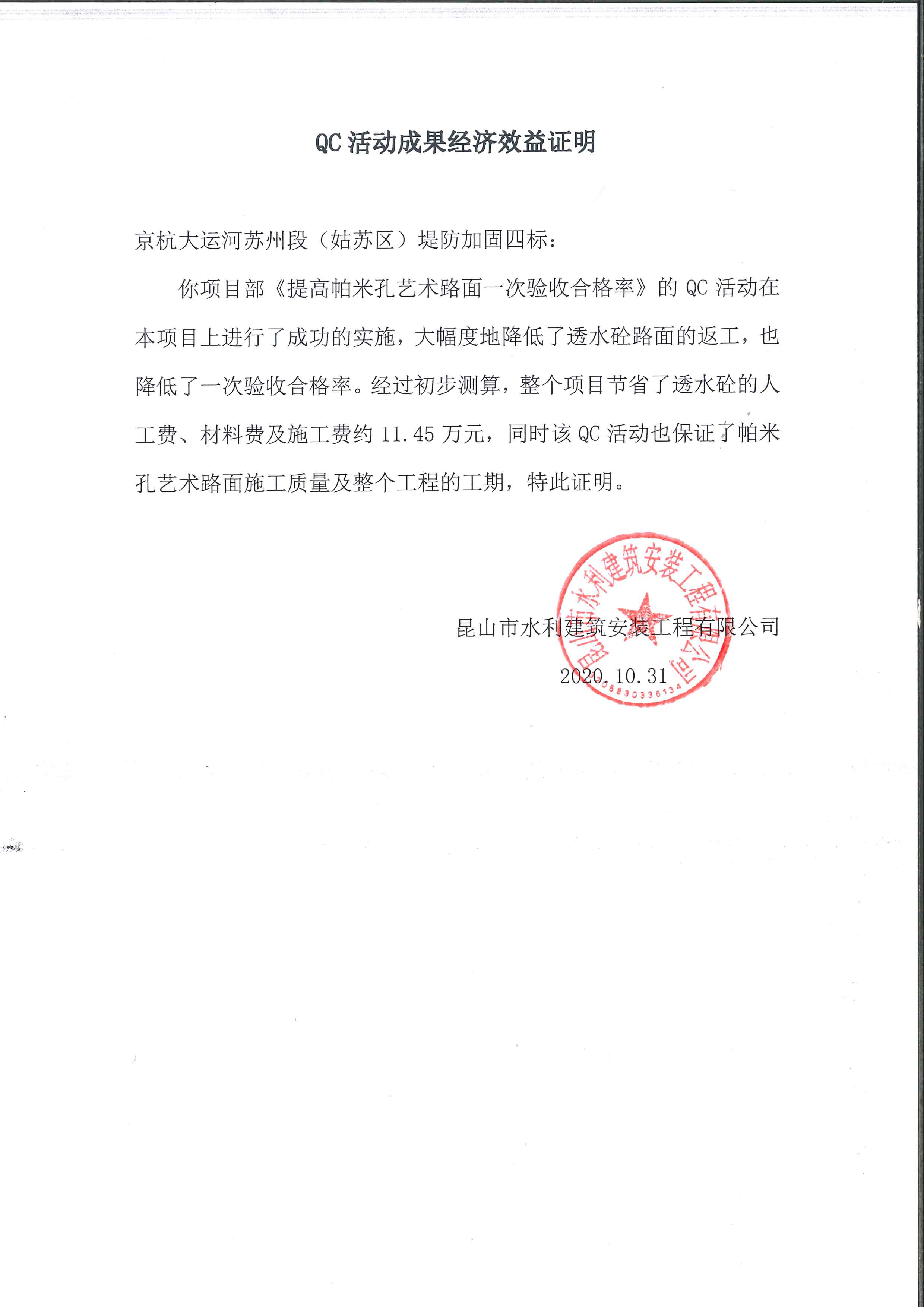 帕米孔藝術(shù)路面透水混凝土施工過(guò)程中,公司給予小組活動(dòng)充分的肯定和大力支持,本小組“帕米孔藝術(shù)路面施工質(zhì)量控制”QC活動(dòng)為我公司在蘇州市姑蘇區贏(yíng)得了良好的質(zhì)量口碑,本次QC活動(dòng)在很大程度上改善了帕米孔藝術(shù)路面的質(zhì)量,為實(shí)現京杭大運河堤防加固工程姑蘇段創(chuàng )優(yōu)目標打下基礎,為評選江蘇省水利工程文明工地創(chuàng )造了有利條件。在工程完工后,一次性驗收合格,觀(guān)感評定達到“良”,得到了建設、監理單位和上級有關(guān)部門(mén)的一致好評,同時(shí)也為我公司在以后類(lèi)似工程的施工中積累了經(jīng)驗。